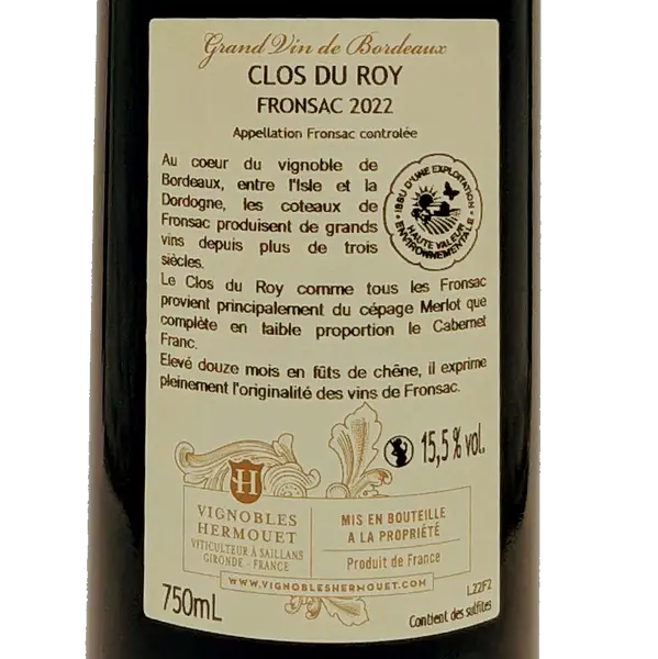 Afkomstig uit de prestigieuze appellatie Fronsac, gelegen ten westen van Saint-Émilion, profiteert deze wijn van een uniek terroir met kalkrijke kleigronden. Dit terroir geeft de wijn zijn kenmerkende kracht en aromatische complexiteit. De wijngaarden worden met zorg beheerd door wijnmaker Philippe Hermouet, die traditie en moderne technieken harmonieus weet te combineren.