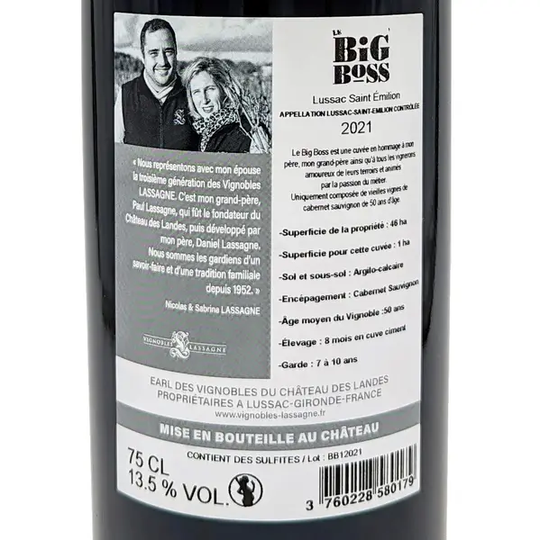 Le Big Boss 2021 komt uit de prestigieuze appellatie Lussac Saint-Émilion, een satellietgebied van het wereldberoemde Saint-Émilion. Hier profiteren de wijnstokken van een kalkrijke bodem en een ideaal microklimaat, wat zorgt voor optimale rijping van de druiven.